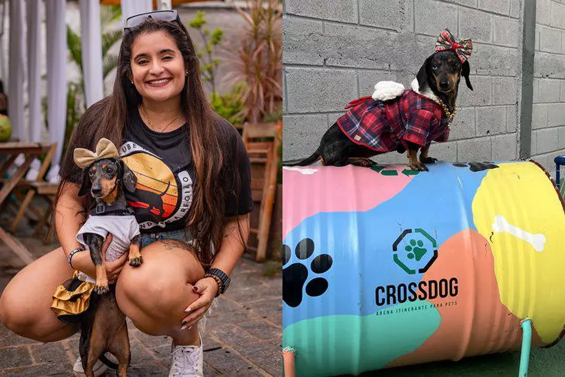 Quem sempre abana o rabo na Arena CrossDog é Keisha, dachshund de 6 anos, acompanhada da tutora Isabella Marques: “Ela ama brincar por todo o espaço que é muito interativo e perfeito para os cães gastarem energia” (foto: Divulgação)