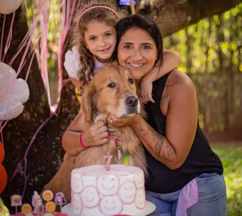 O aniversário de 7 anos da golden retriever Nina foi comemorado no Espaço Petisar com festa groovy, muitas guloseimas e até bingo cheio de prêmios: “Foi um sucesso total. O espaço é perfeito para os pets”, diz a tutora, Carolina Almeida, que estava acompanhada da filha Beatriz (foto: Anna Vargas/Divulgação)