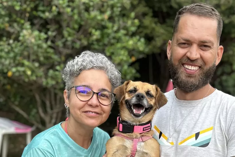 Solange, vira-lata de 6 anos, se esbaldou no Mariza Paiva Dogs House. “Eles adoraram a piscina quentinha”, diz Marcos, ao lado da proprietária do espaço (foto: Arquivo pessoal)